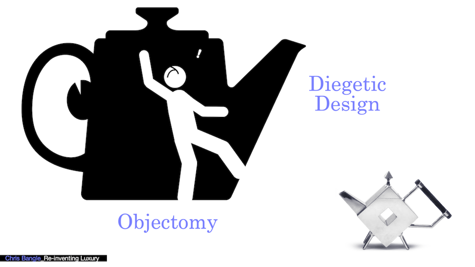 Bangle uses a dramatic example in a humble teapot that foreshadows the machine age look that is still with us but was designed three decades before the birth of modernism. When you listen deeply to such an object and let that guide your actions, you are no longer outside the narrative looking in but rather part of the storytelling. He explains: “You begin to design ‘diegetically,’ inside the narrative, then suddenly design processes become wonderful design adventures.”